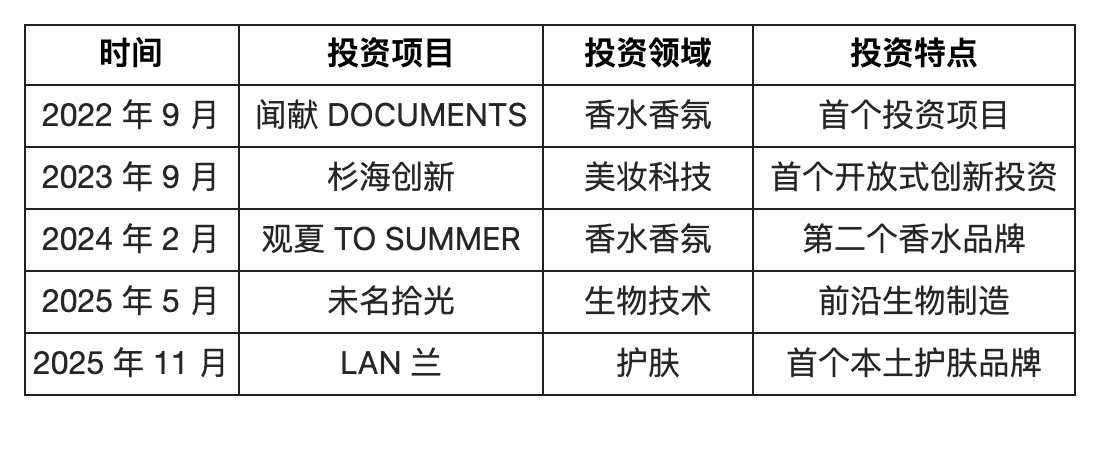自成立至今,美次方已完成5个主要投资项目,覆盖以杉海创新、未名拾光为代表的美妆科技与生物技术领域,以闻献、观夏为代表的高端香水香氛领域,以及本次投资所涉及到的护肤品领域。